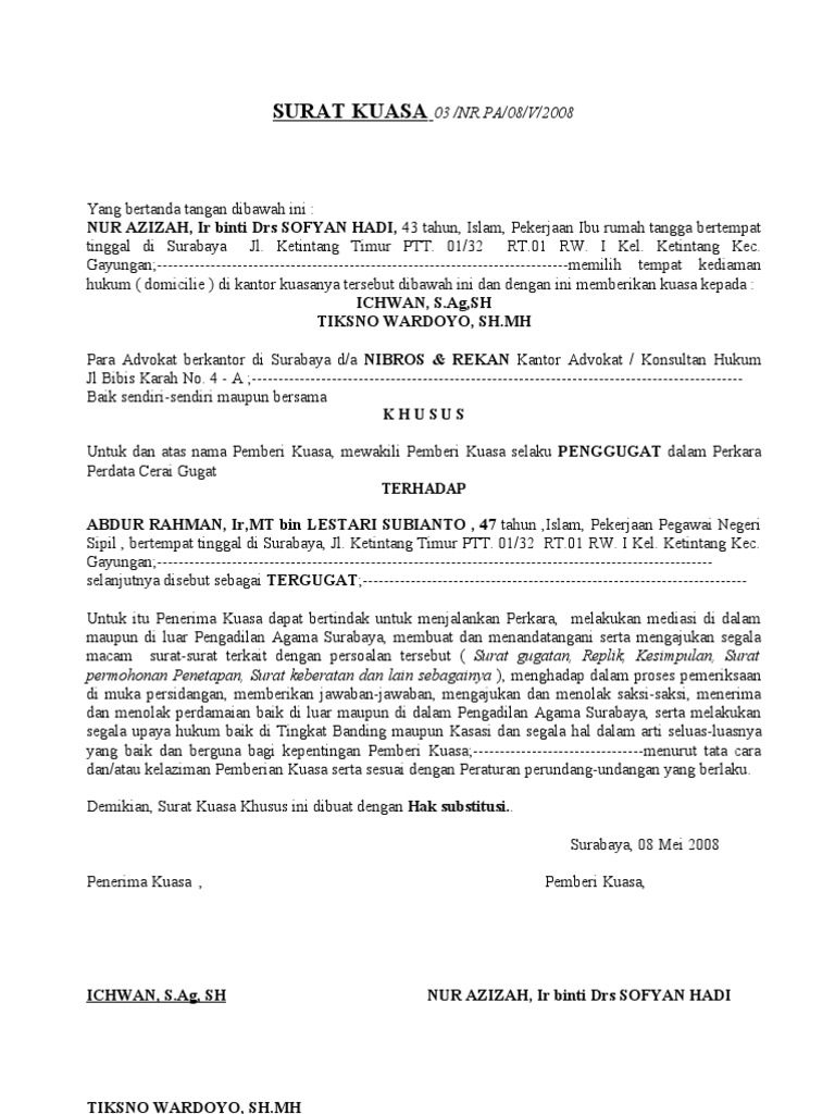 Contoh Surat Kuasa Cerai Talak Nusagates