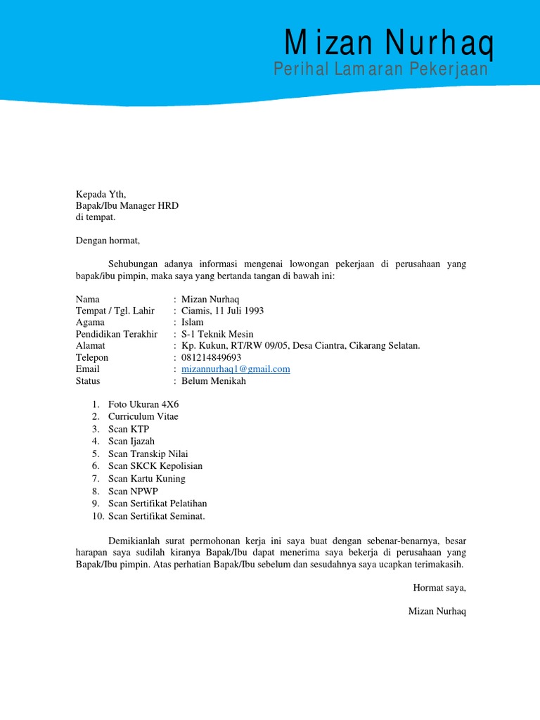 Tesis ini menjadi salah satu hal yang harus ada di dalam surat lamaran kerja. 0145HRD-PMP II2015 Kepada Yth. 5 Tips Membuat CV yang Menarik. HRD Manager PT Berkas Jaya Grup Jl. Lamaran Pekerjaan Kepada Yth. Suka Karya RTV Lr.